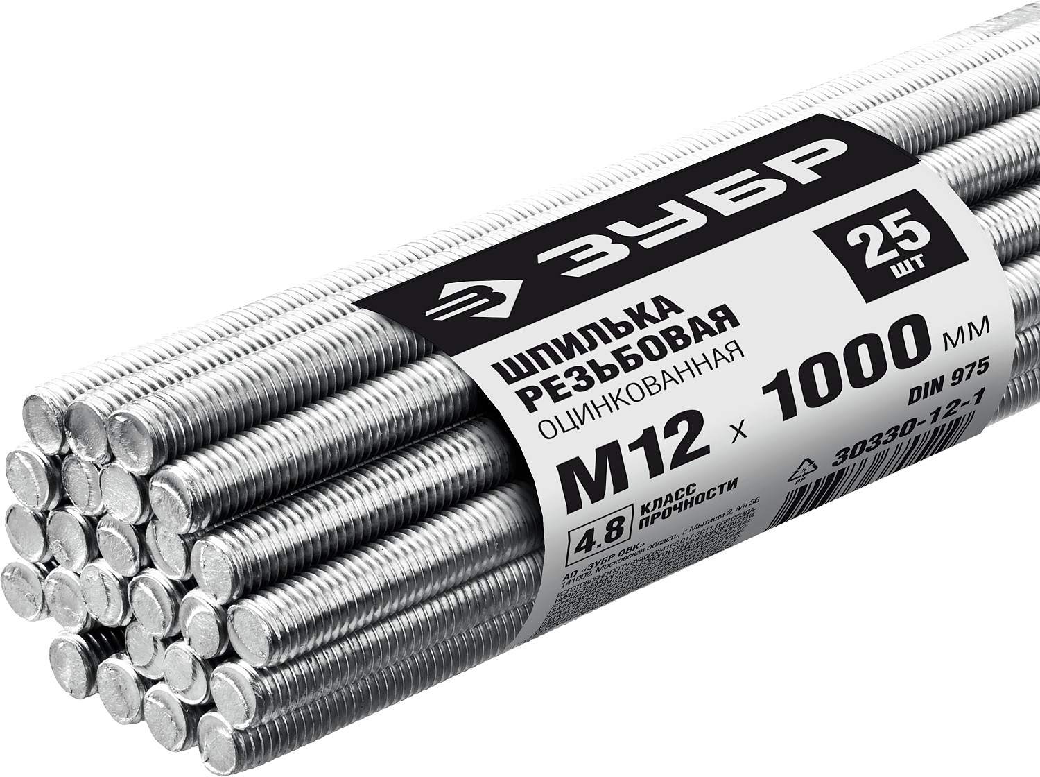 ЗУБР DIN 975, кл. пр. 4.8, М12 х 1000 мм, цинк, 25 шт, резьбовая шпилька (30330-12-1)