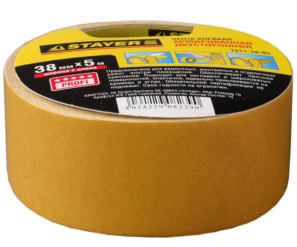 STAYER 38 мм, 5 м, на тканевой основе, двухсторонняя клейкая лента, Professional (1217-38-05)