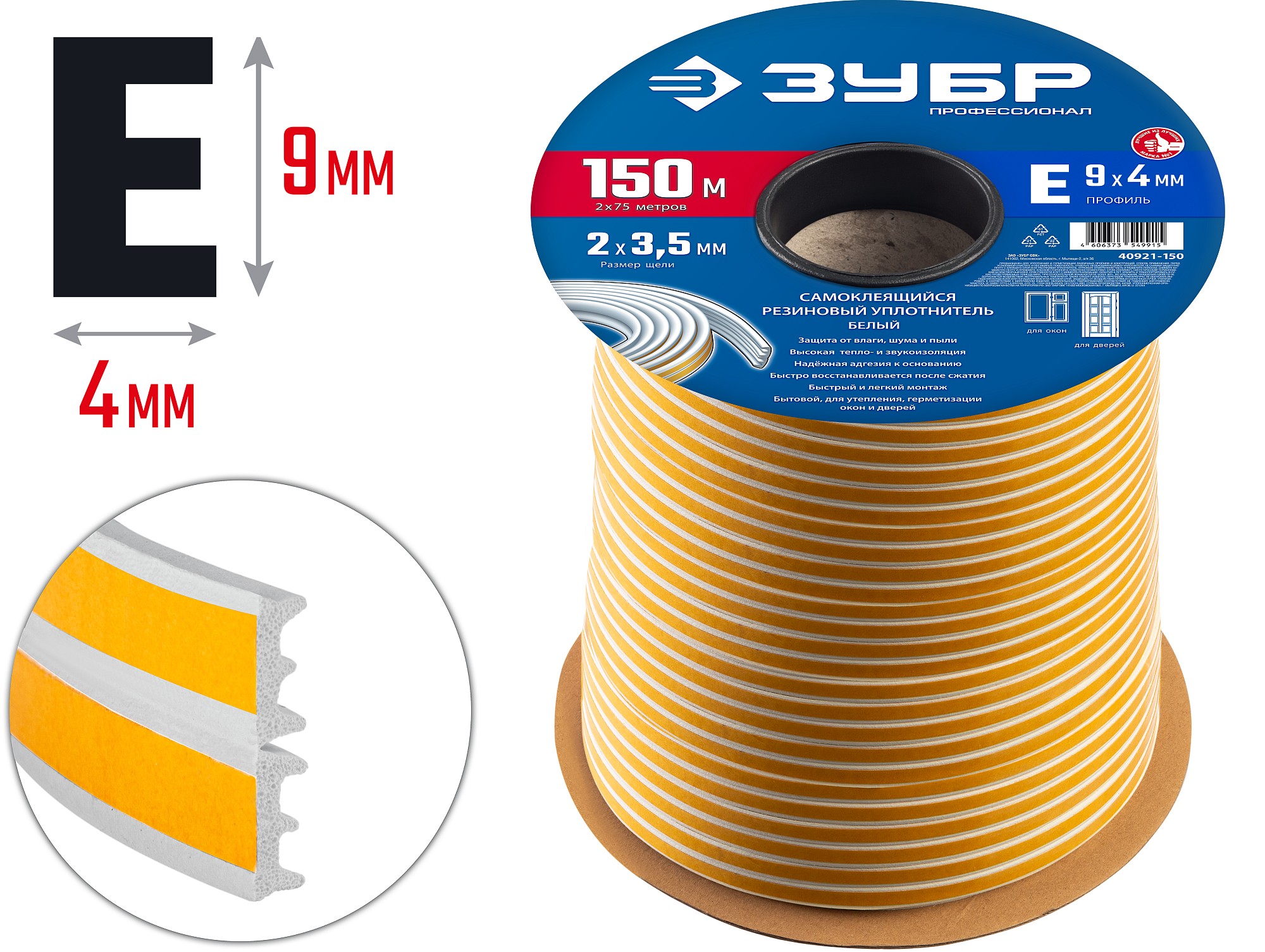 ЗУБР 150 м, E-профиль, размер 9 х 4 мм, белый, самоклеящийся резиновый уплотнитель, Профессионал (40921-150)
