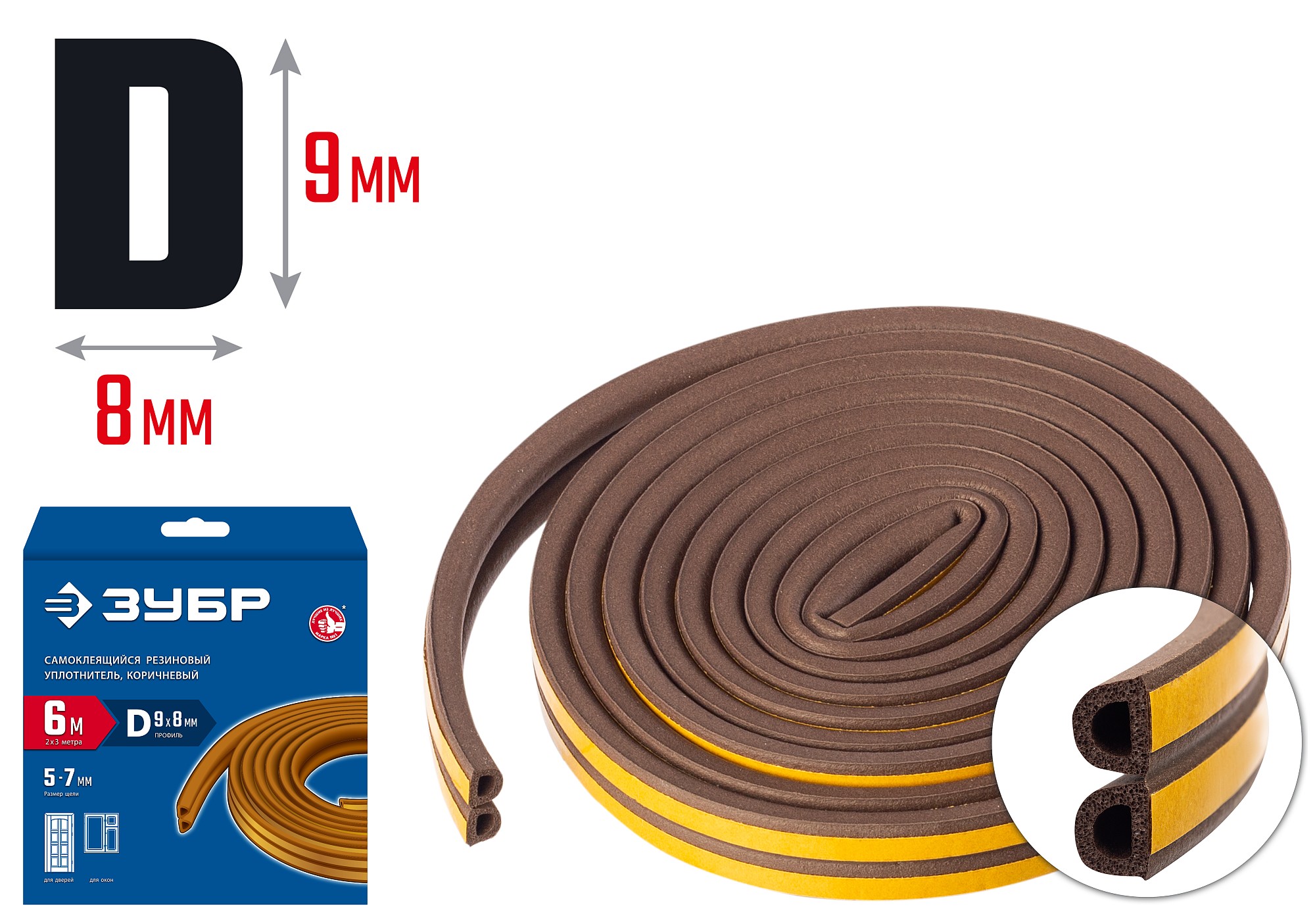 ЗУБР 6 м, D-профиль, размер 9 х 8 мм, коричневый, самоклеящийся резиновый уплотнитель, Профессионал (40930-006)