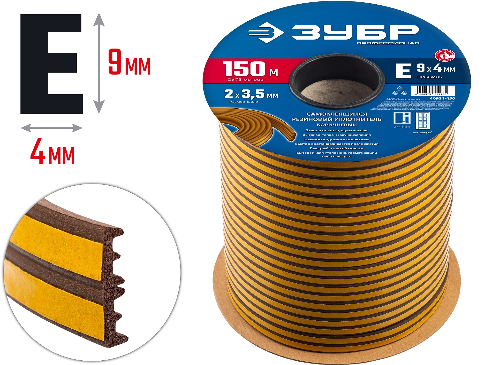 ЗУБР 150 м, E-профиль, размер 9 х 4 мм, коричневый, самоклеящийся резиновый уплотнитель, Профессионал (40931-150)