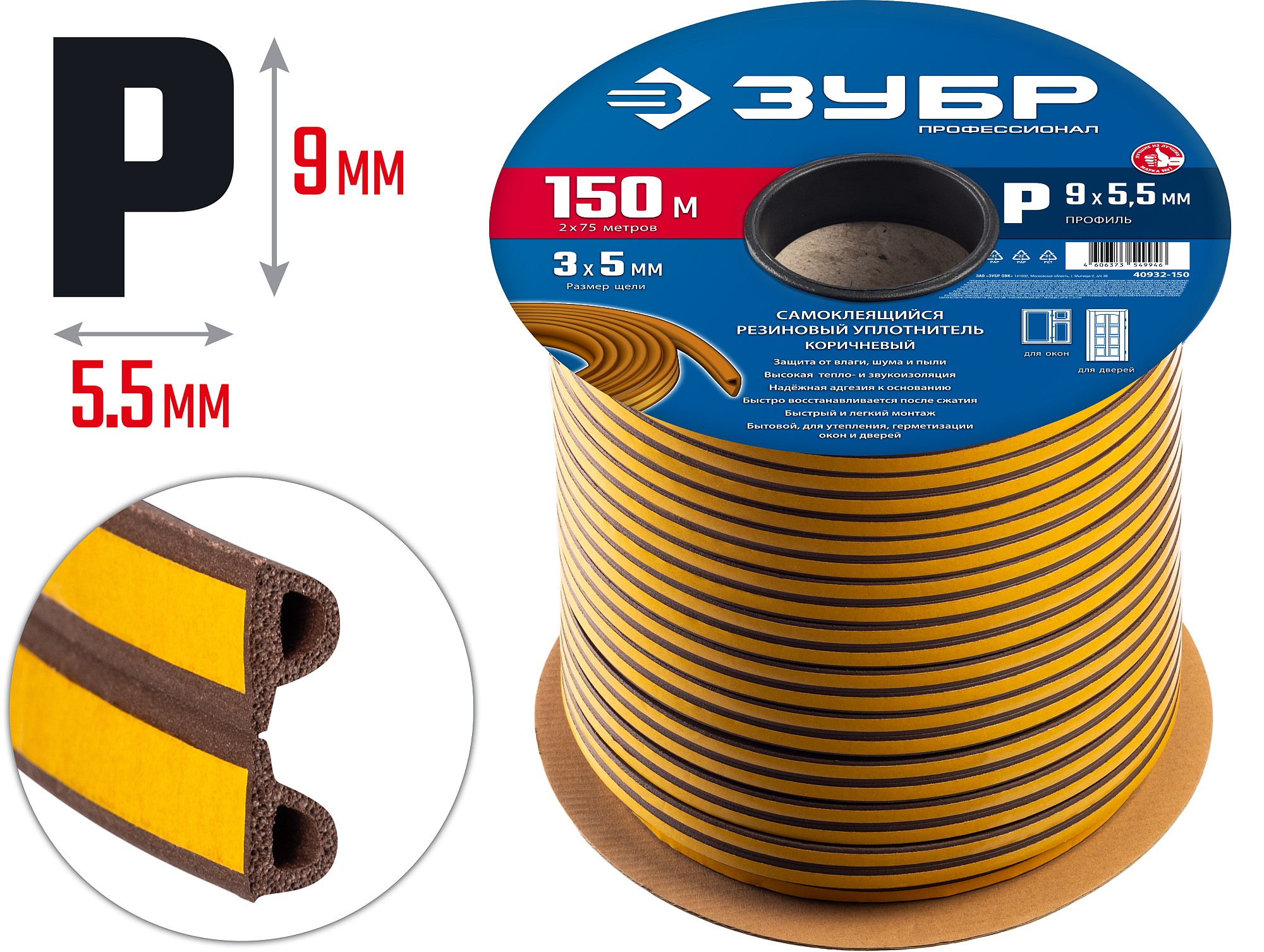 ЗУБР 150 м, P-профиль, размер 9 х 5.5 мм, коричневый, самоклеящийся резиновый уплотнитель, Профессионал (40932-150)