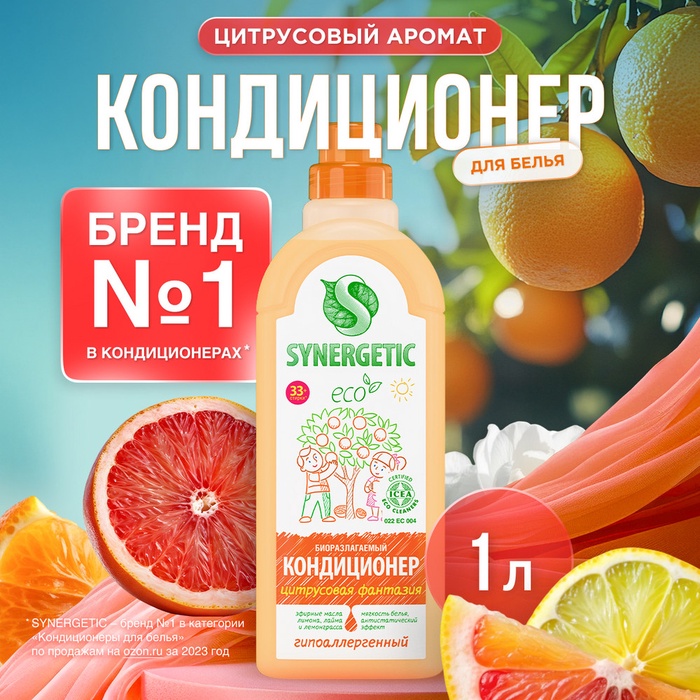 Кондиционер-ополаскиватель для белья Synergetic «Цитрусовая фантазия», гипоаллергенный, 1 л