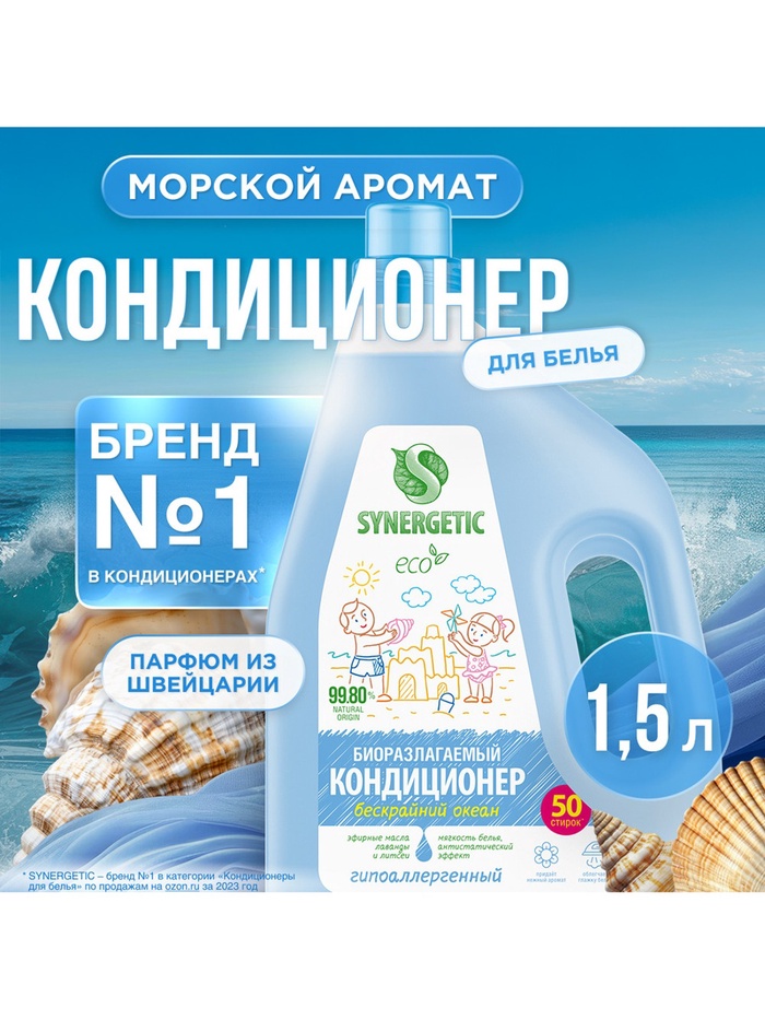 Кондиционер-ополаскиватель для белья SYNERGETIC Бескрайний океан, биоразлагаемый, 1.5 л