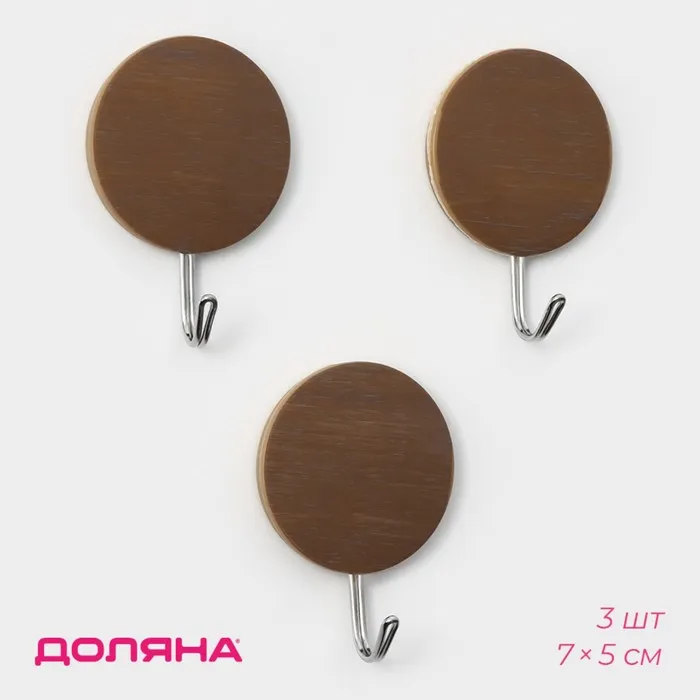 Крючки самоклеящиеся Доляна «Деревянные круги», 3 шт., коричневые