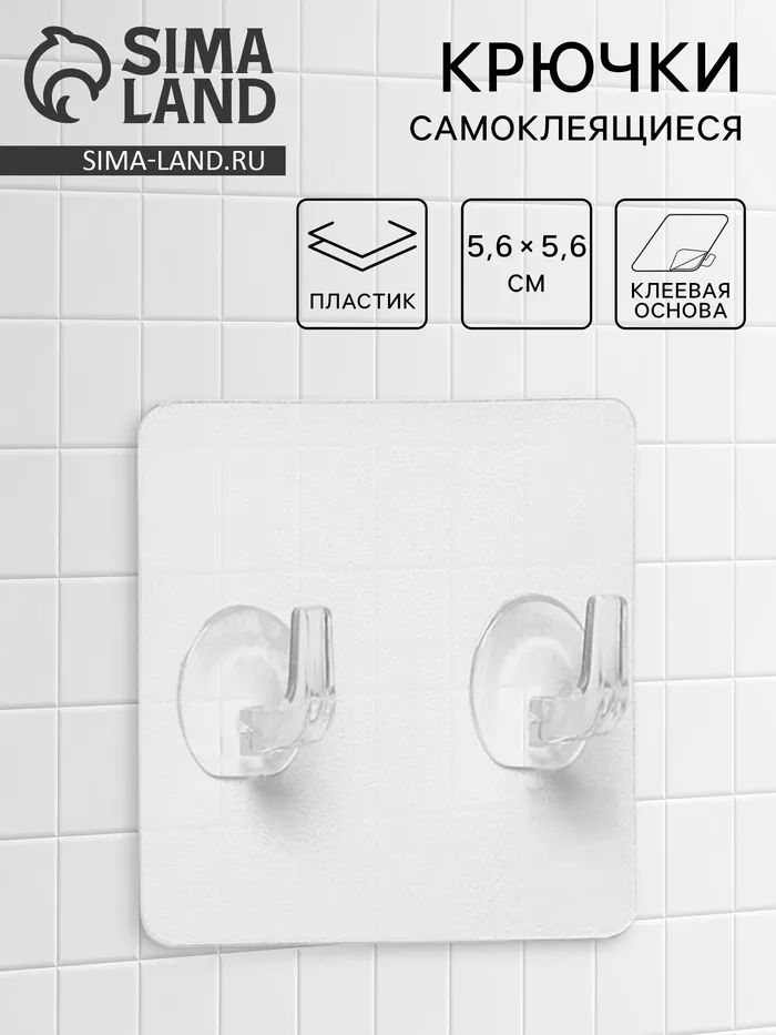 Крючки двойные самоклеящиеся настенные прозрачные, 5.6×5.6 см, 5 шт.