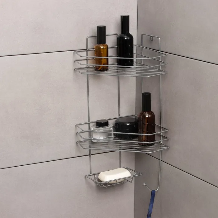 Полка угловая с мыльницей и вешалкой 2-х ярусная, 25,5×42,5 см, цвет хром