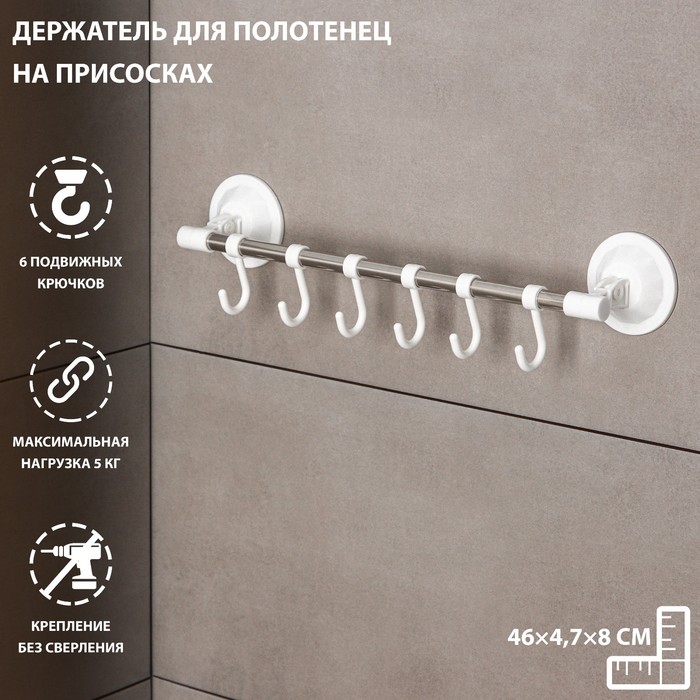 Держатель для полотенец на присосках, 6 подвижных крючков 46×4,7×8 см, цвет белый