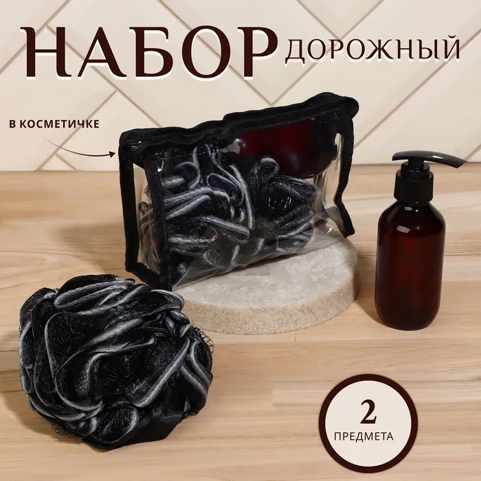 Набор дорожный, в косметичке, 2 предмета (мочалка, бутылочка 150 мл), цвет чёрный