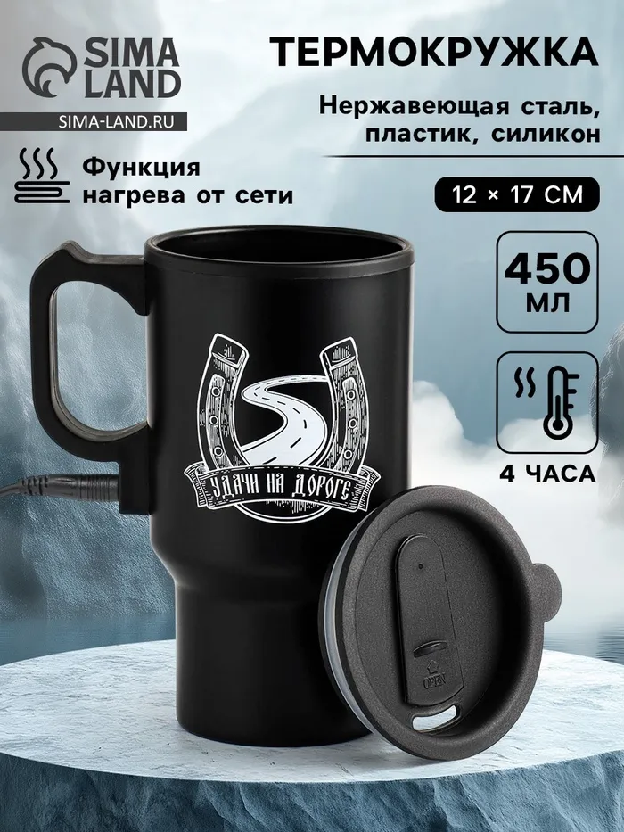 Термокружка автомобильная, 450 мл, «Удачи на дороге», сохраняет тепло 4 ч, 12×17 см
