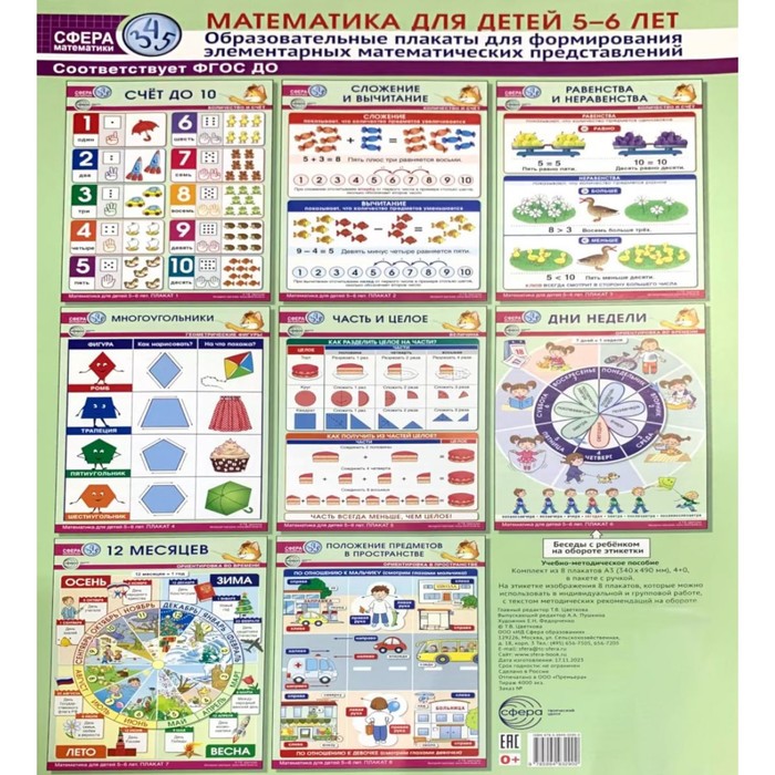 Математика для детей 5-6 лет «Образовательные плакаты для формирования элементарных математических представлений», комплект из 8 плакатов А3, Цветкова Т. В.