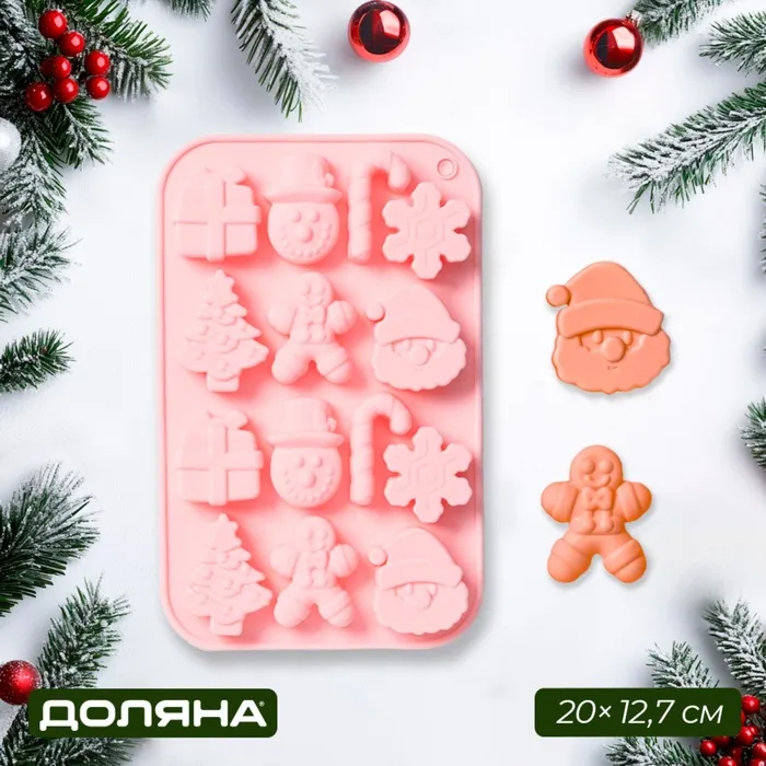 Форма для выпечки новогодняя Доляна «Новогоднее настроение», силикон, 23×19×2.5 см, 6 ячеек, розовая