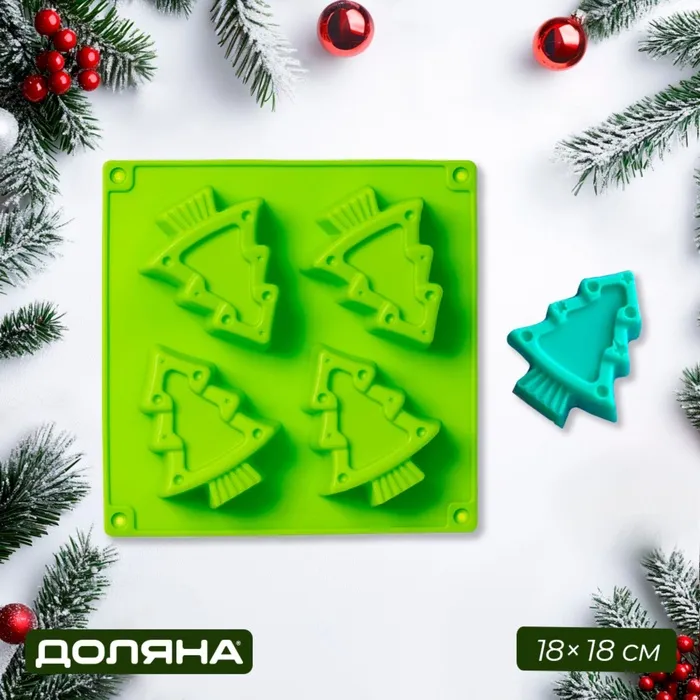 Форма для выпечки Доляна «Новый год. Ёлочки», силикон, 18×18 см, 4 ячейки, зелёная