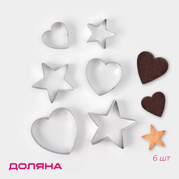 Формы для печенья Доляна «Сердце, звёздочка», набор 6 шт., 7×13×1.5 см, металл, серебристые