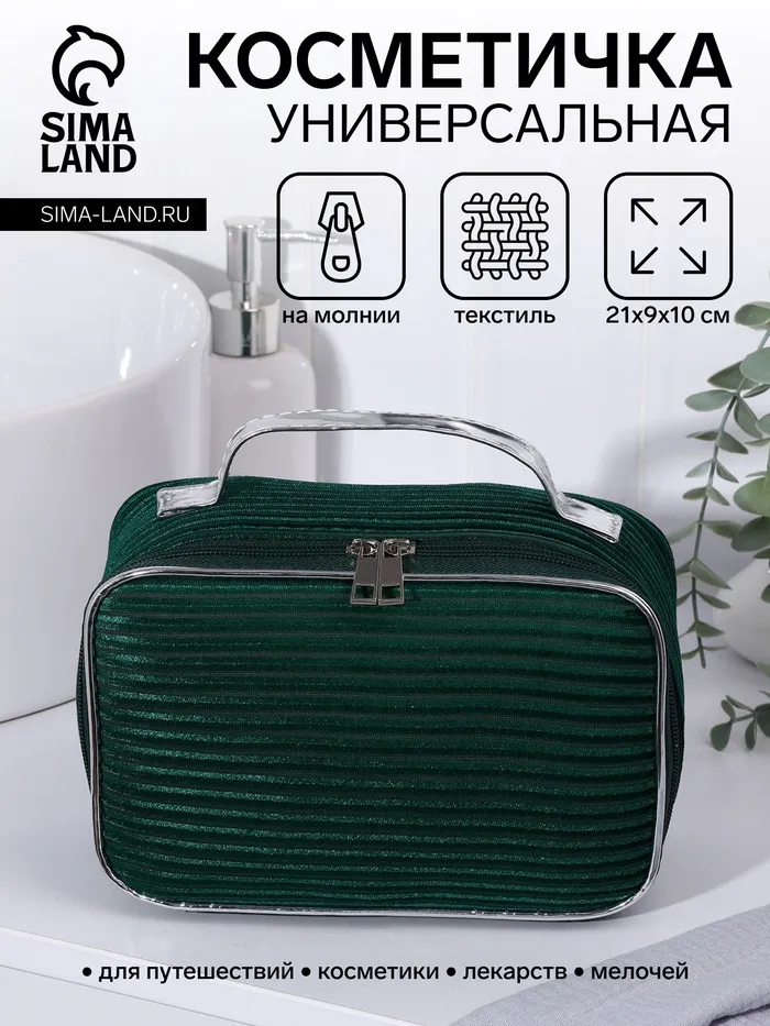 Косметичка-сундучок женская на молнии, на подкладке, с ручкой, зелёная