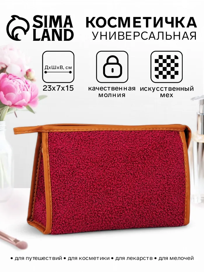 Косметичка на молнии, треугольная, плюшевая, малиновая