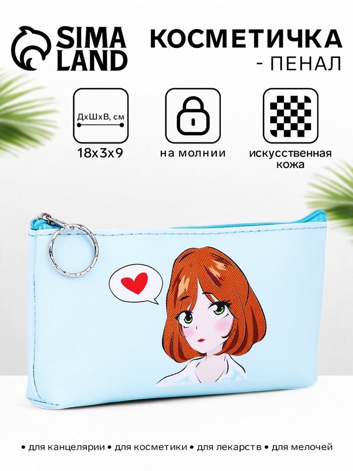 Косметичка-пенал на молнии, с рисунком «Аниме девочка», голубая