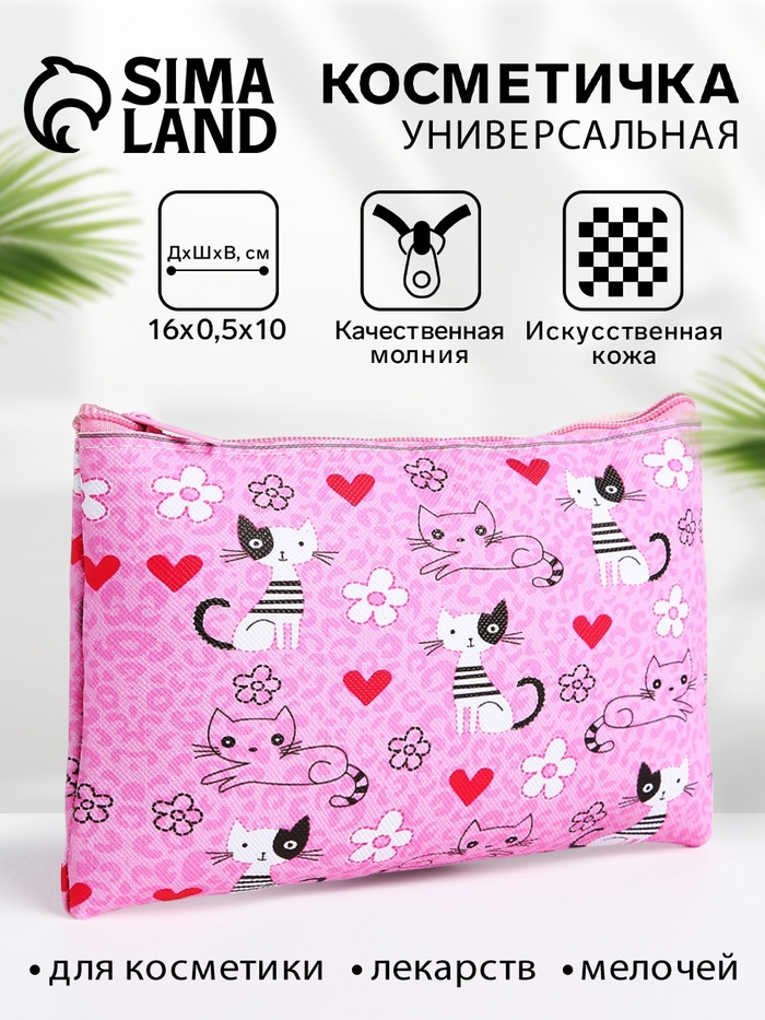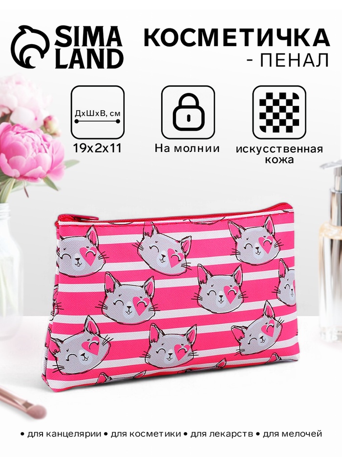 Косметичка-пенал на молнии, плоская, с рисунком «Полосатые коты», розовая