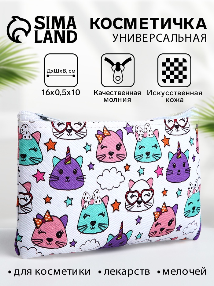 Косметичка-пенал на молнии, плоская, с рисунком «Волшебные коты», белая