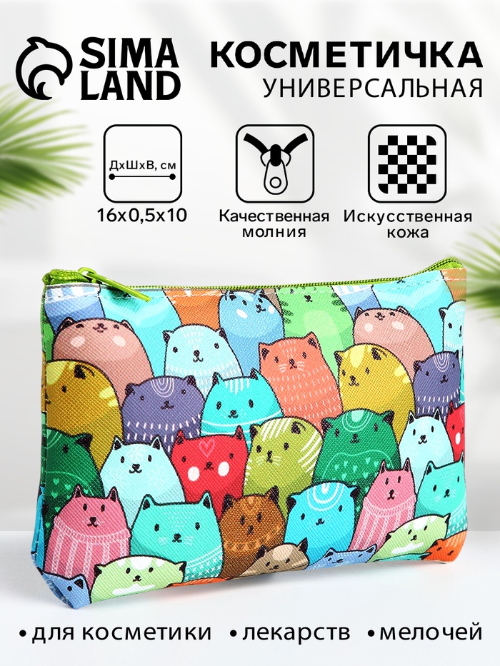 Косметичка-пенал на молнии, плоская, с рисунком «Разноцветные коты», разноцветная