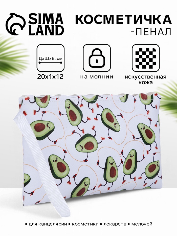 Косметичка-пенал на молнии, плоская, с ручкой, с рисунком «Авокадо», белая