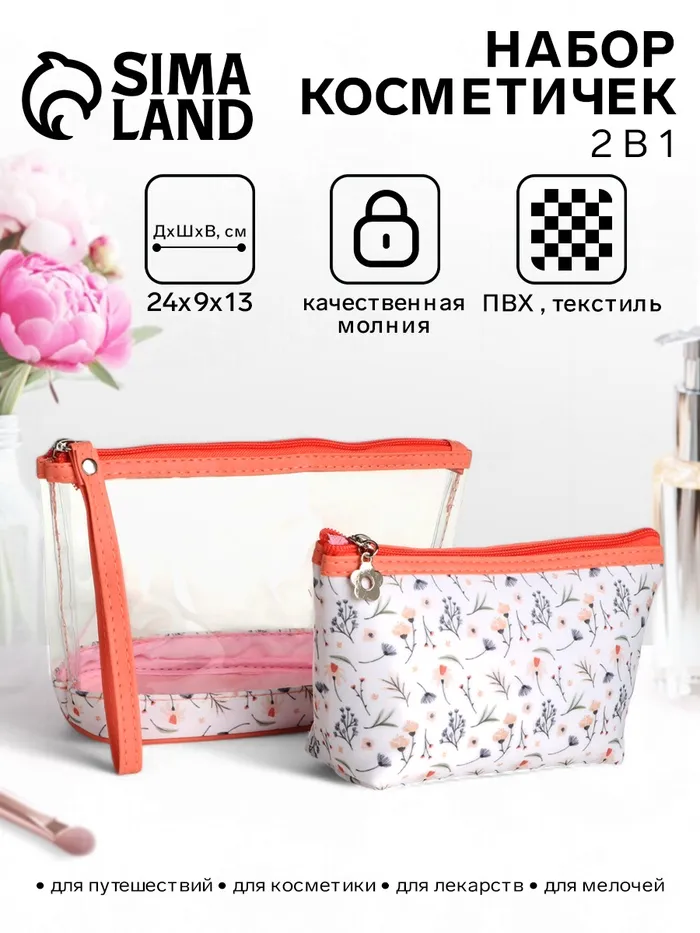 Набор простых косметичек на молниях 2 в 1, с принтом, коралловая