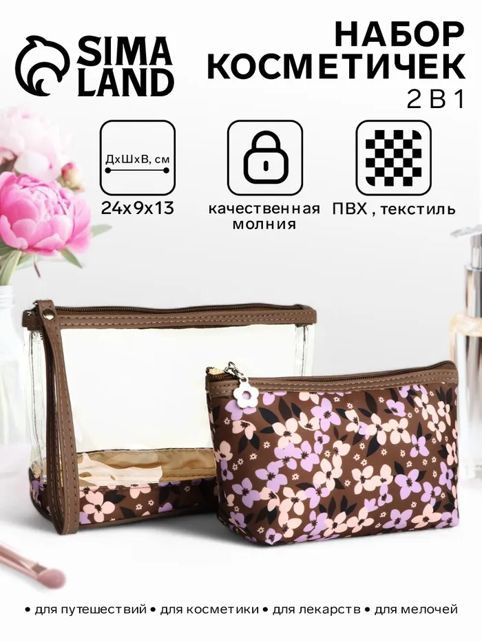 Набор простых косметичек на молниях 2 в 1, с принтом, коричневый