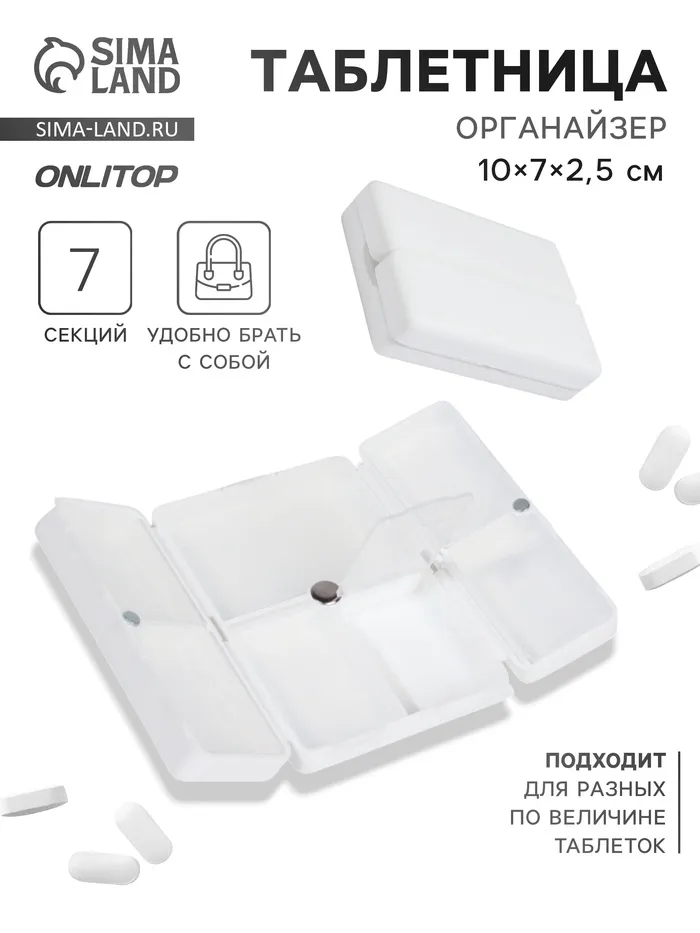 Таблетница - органайзер, 10×7×2.5 см, 7 секций, белая