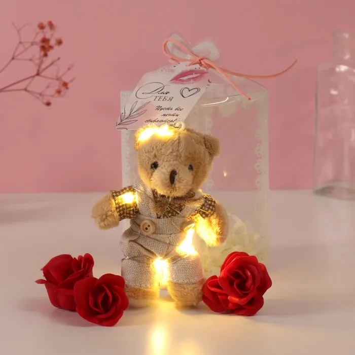 Набор подарочный «Мишка в комбинезоне», мыльные красные розы 5 шт., роса, 7×7×12 см
