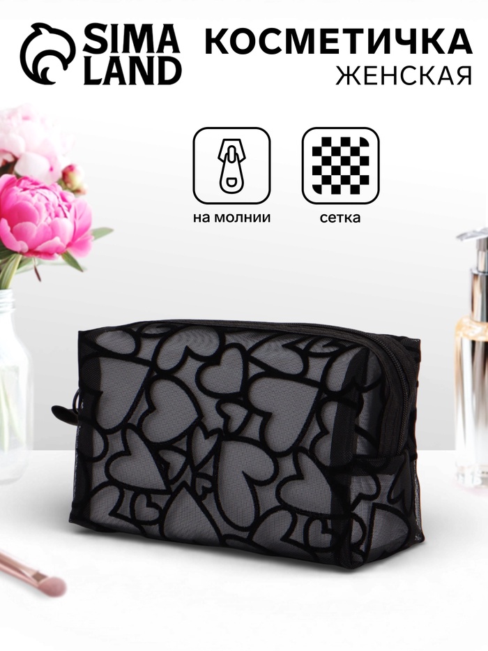 Косметичка квадратная Black beauty, с рисунком, на молнии, чёрная