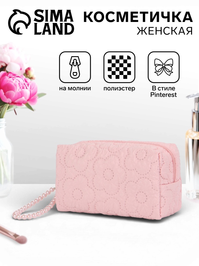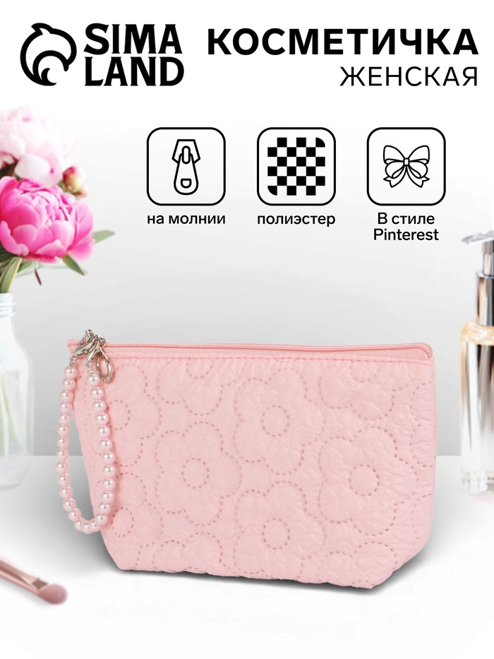 Косметичка женская «Цветочки», на молнии, ручка из бусин, розовая