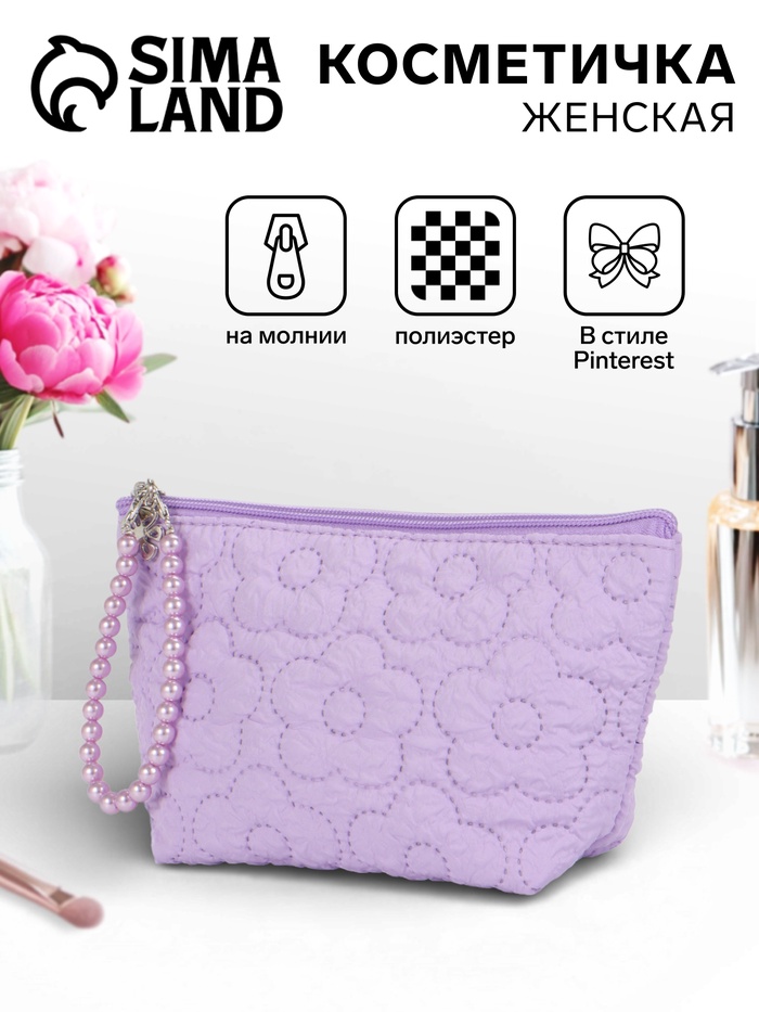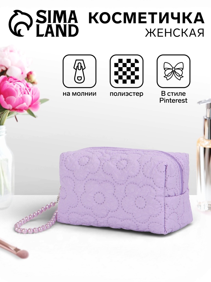 Косметичка женская «Цветочки», на молнии, ручка из бусин, сиреневая