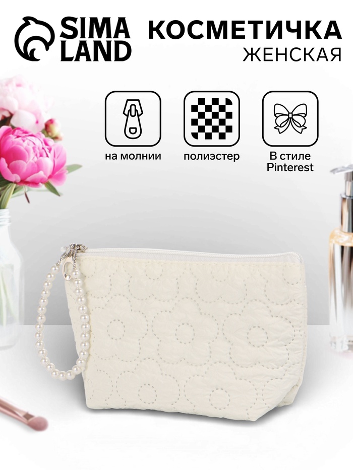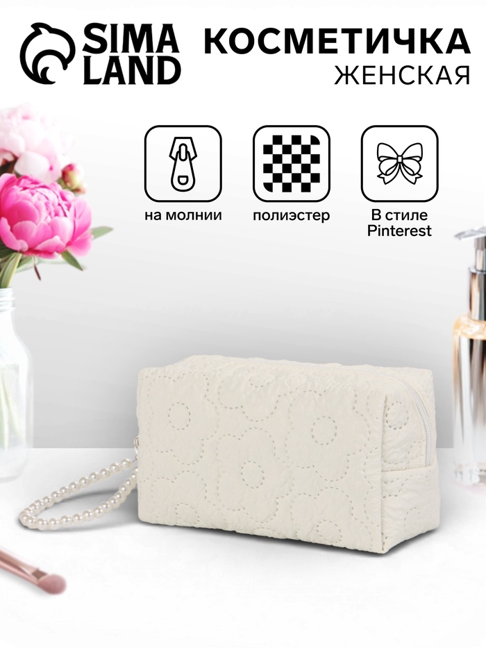 Косметичка женская «Цветочки», на молнии, ручка из бусин, молочная