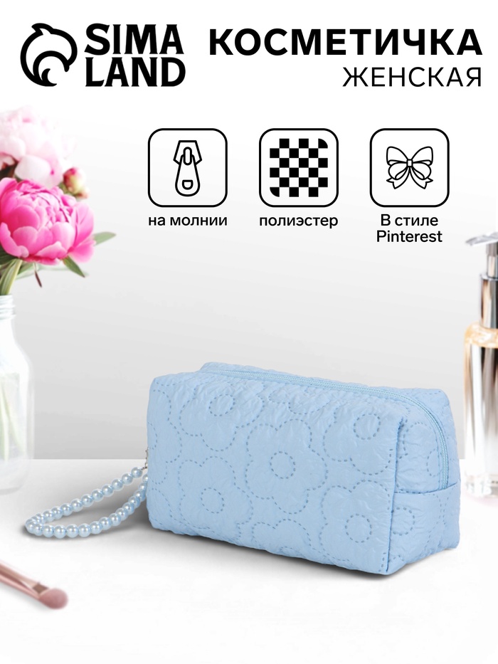 Косметичка женская «Цветочки», на молнии, ручка из бусин, голубая