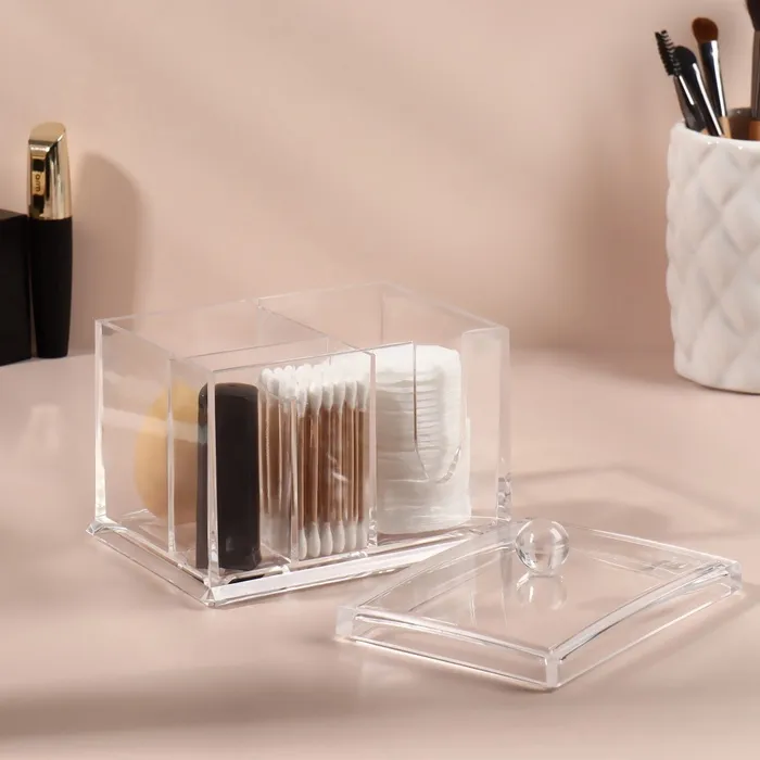 Органайзер для ватных палочек и дисков, с крышкой, 2 секции, 12.5×7.3×13.5 см, прозрачный