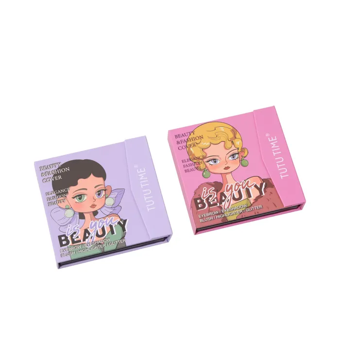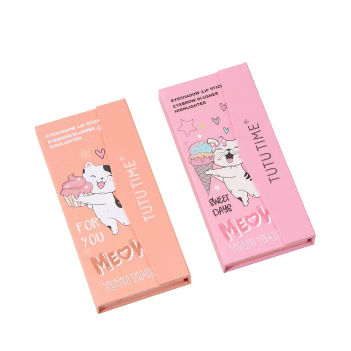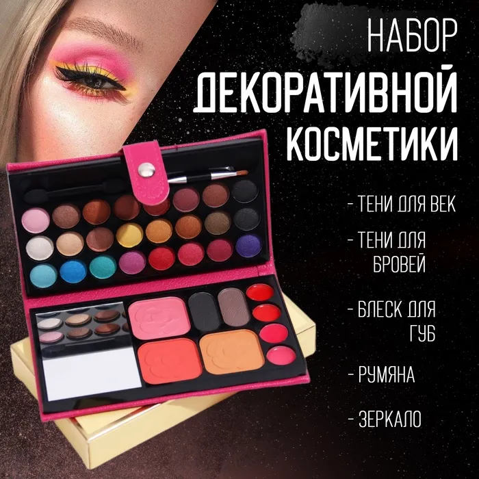 Набор декоративной косметики: тени для век, тени для бровей, блеск для губ, румяна, зеркало