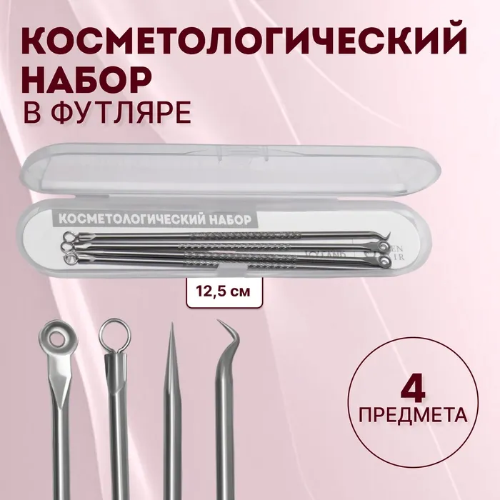 Косметологический набор, 4 предмета, в пластиковом футляре, 11.5 см, серебристый