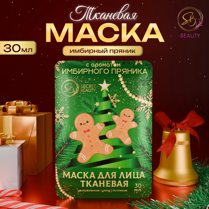 Новогодняя маска для лица, тканевая, увлажняющая, с ароматом имбирного пряника