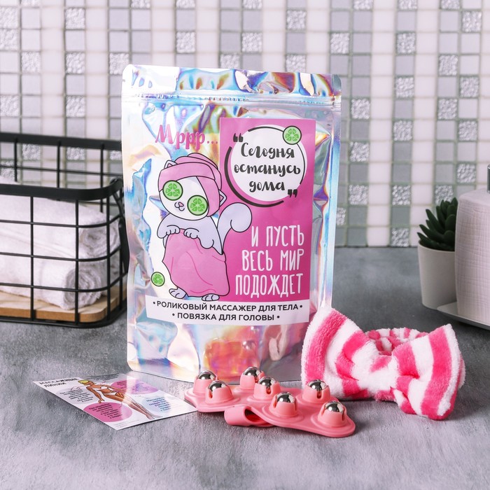 Набор: повязка для головы и роликовый массажёр «Мрр», розовый, 19×8.5 см