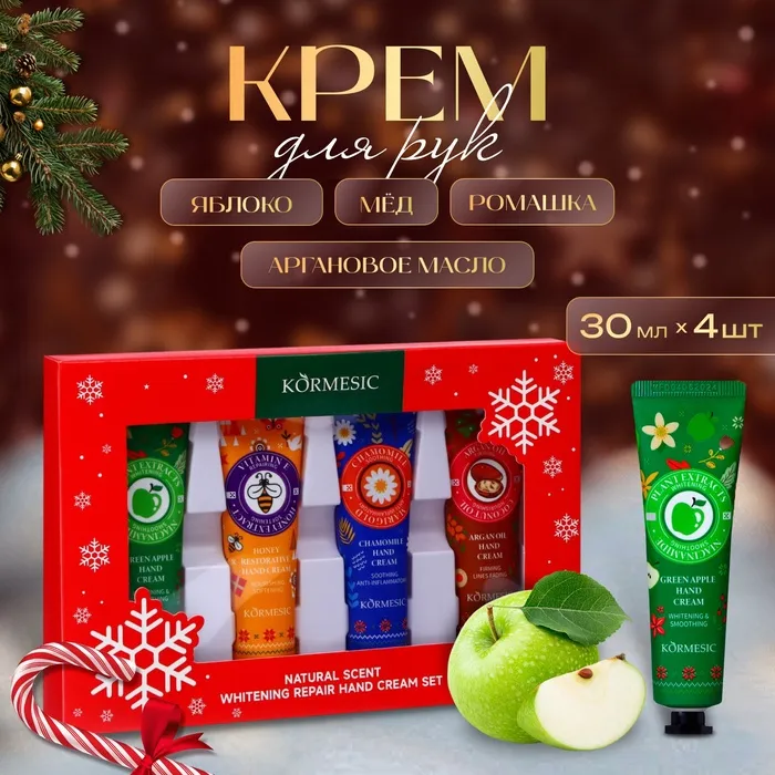 Новогодний подарочный набор косметики. Крема для рук по 30 мл, 4 шт (яблоко, мёд, ромашка, аргановое масло)