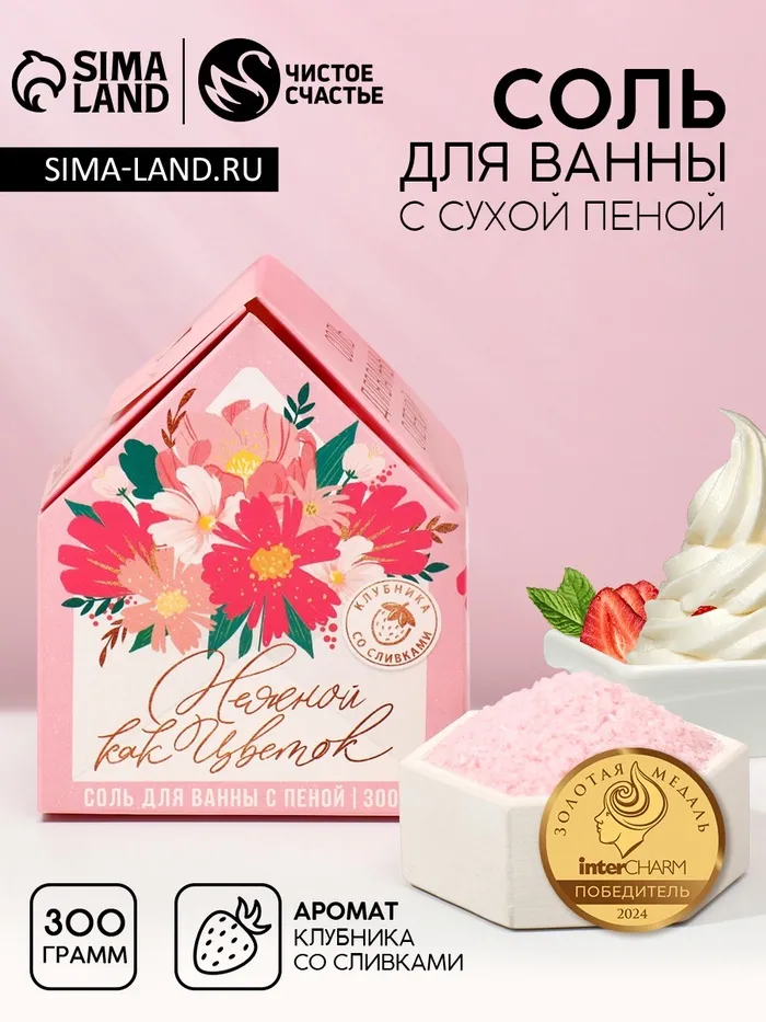 Соль для ванны с сухой пеной «Нежной, как цветок», клубника со сливками