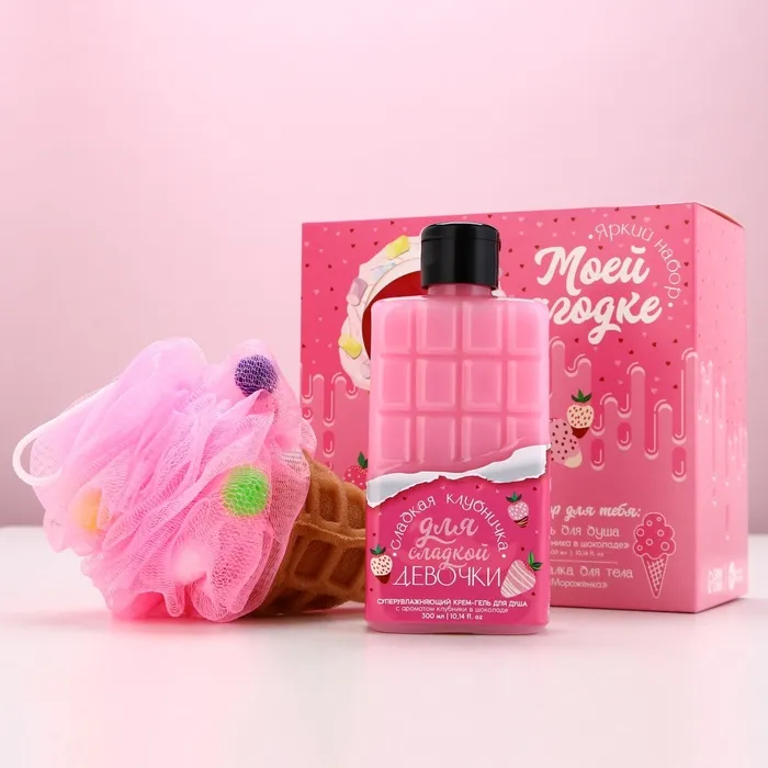 Подарочный набор косметики «Моей ягодке», гель для душа 300 мл и мочалка, аромат клубники в шоколаде, Чистое счастье