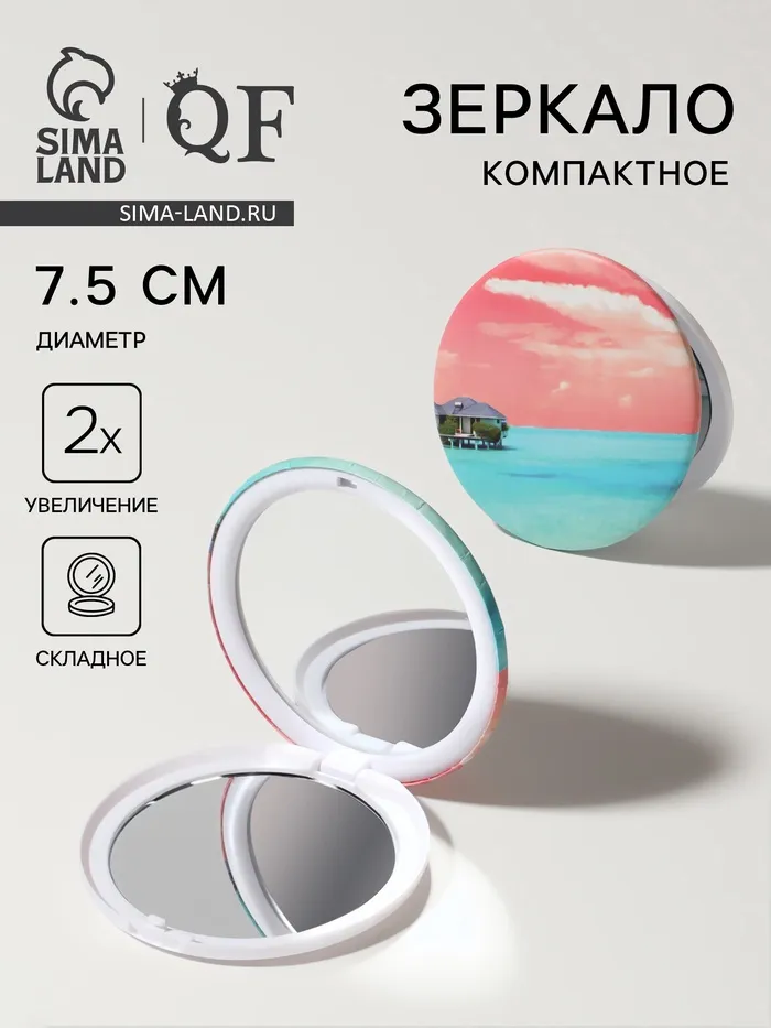 Зеркало складное «Пляж», d=7.5 см, с увеличением х2, розовое/бирюзовое