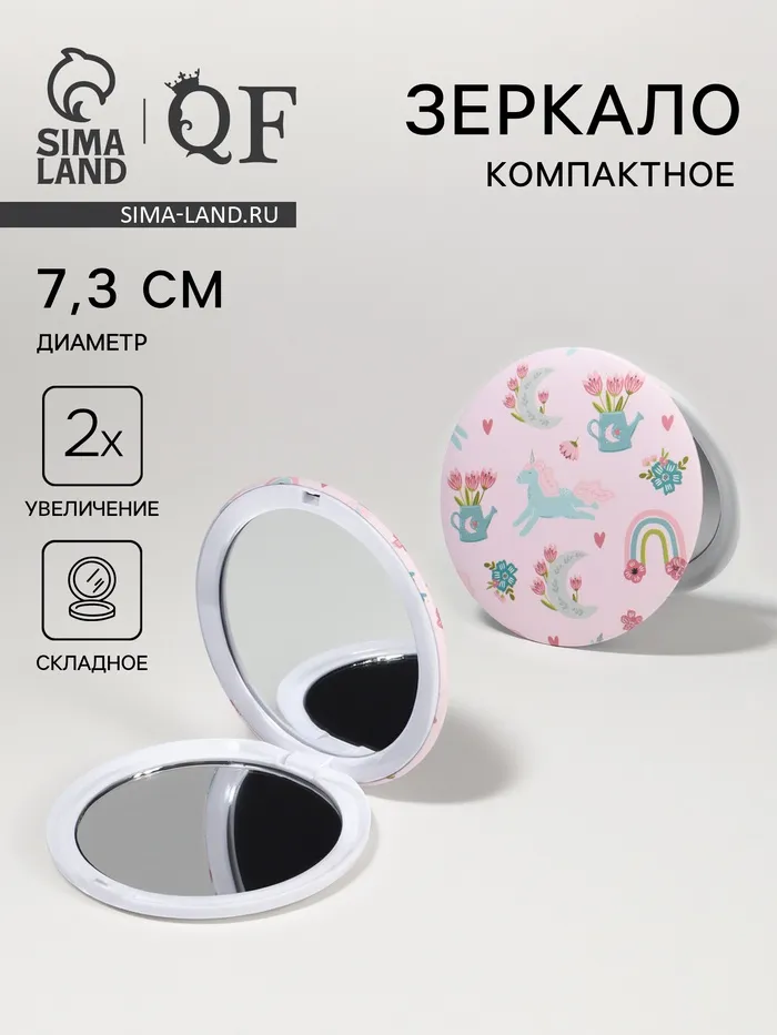 Зеркало складное «Единороги», d=7.3 см, с увеличением х2, розовое