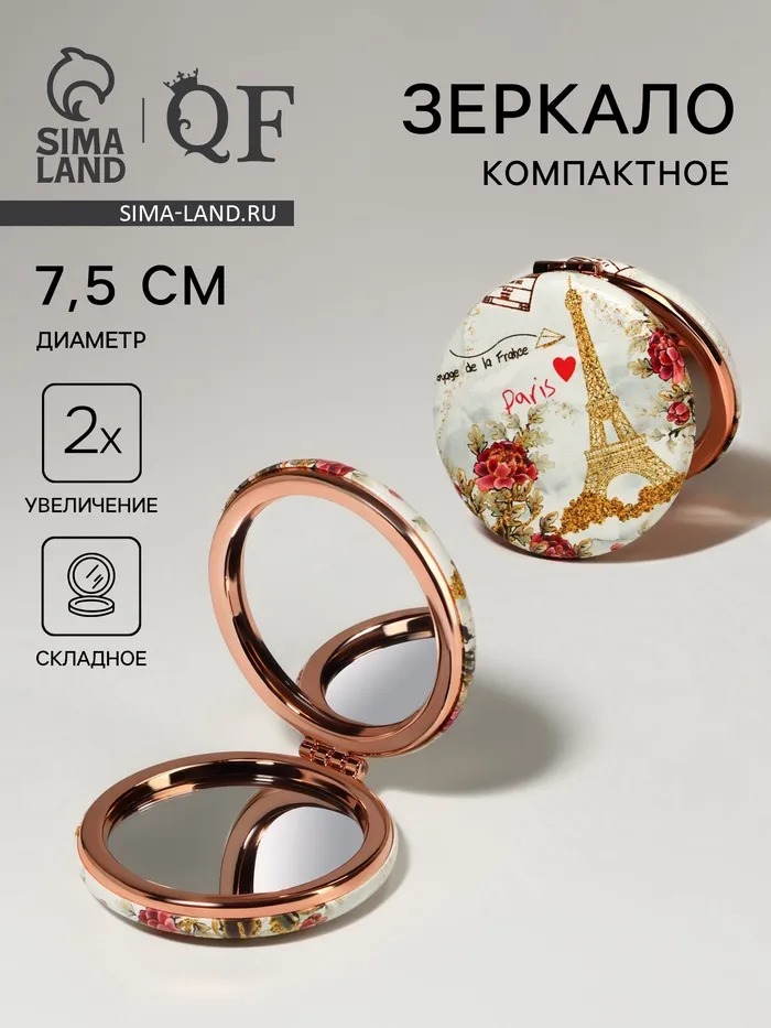 Зеркало складное «Париж», d=7.5 см, с увеличением х2, искусственная кожа, цвет золотистый
