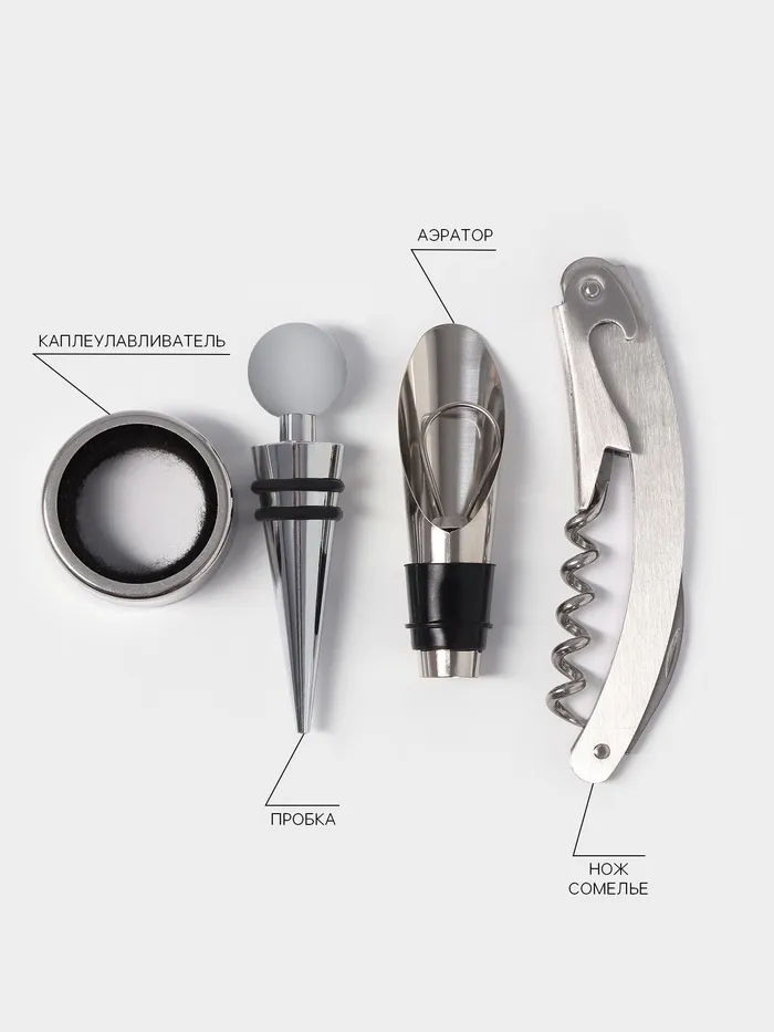 Подарочный набор для вина «Для ценителей», штопор, аэратор, каплеулавливатель, пробка для бутылки, нож для фольги