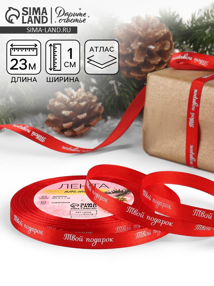 Лента атласная «Твой подарок», 10 мм, 23 ± 1 м, цвет красный №26