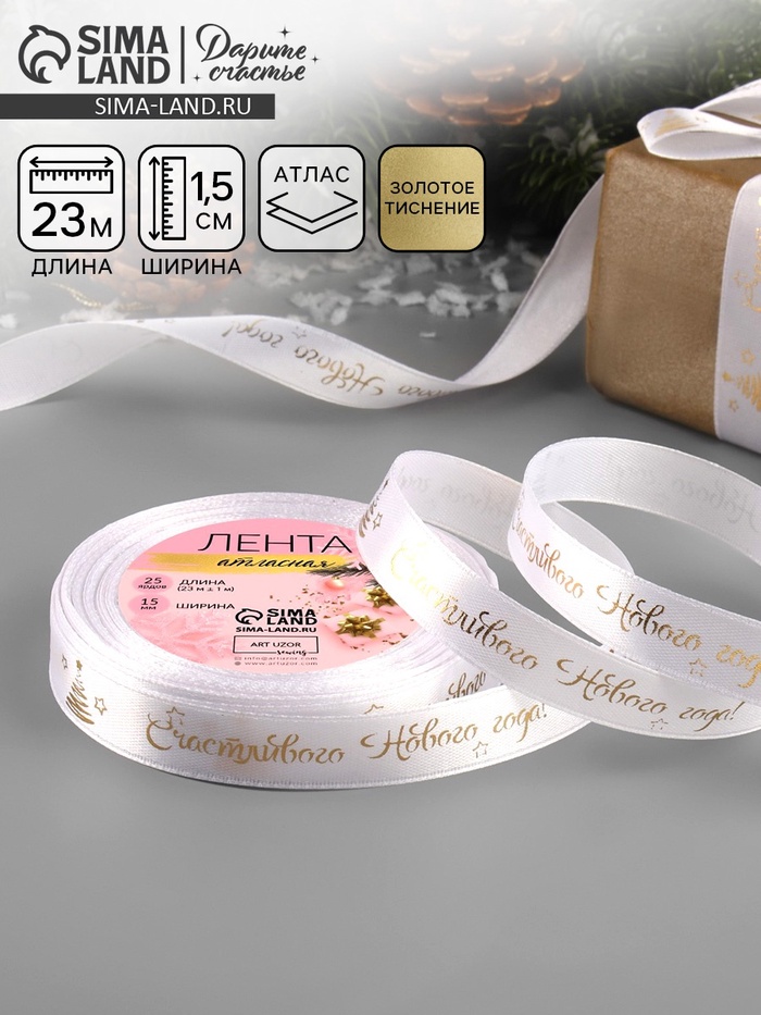 Лента атласная с тиснением «Счастливого Нового года!», 15 мм, 23±1 м, белая