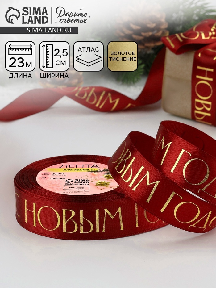 Лента атласная с тиснением «С Новым годом», 25 мм, 23±1 м, бордовый