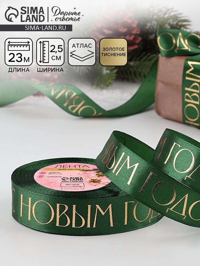 Лента атласная с тиснением «С Новым годом», 25 мм, 23±1 м, тёмно-зелёный